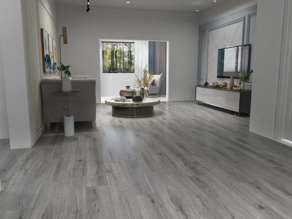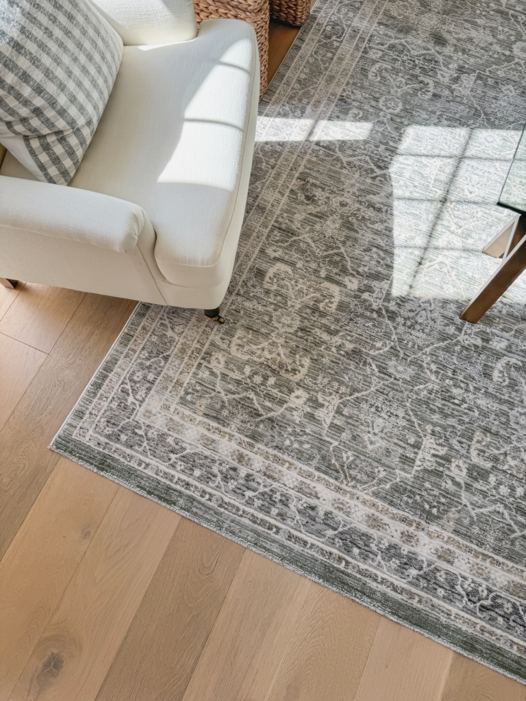 The ash gray wood flooring is the perfect foundation for the room’s design, and it’s complemented by a gray area rug.