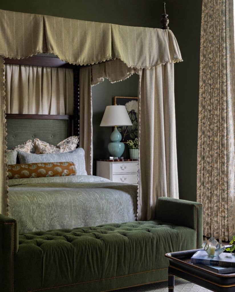 This cozy bedroom by Chango & Co. is a masterclass in layering. The room is decked out with a variety of green and gray hues, but the design never feels overwhelming.