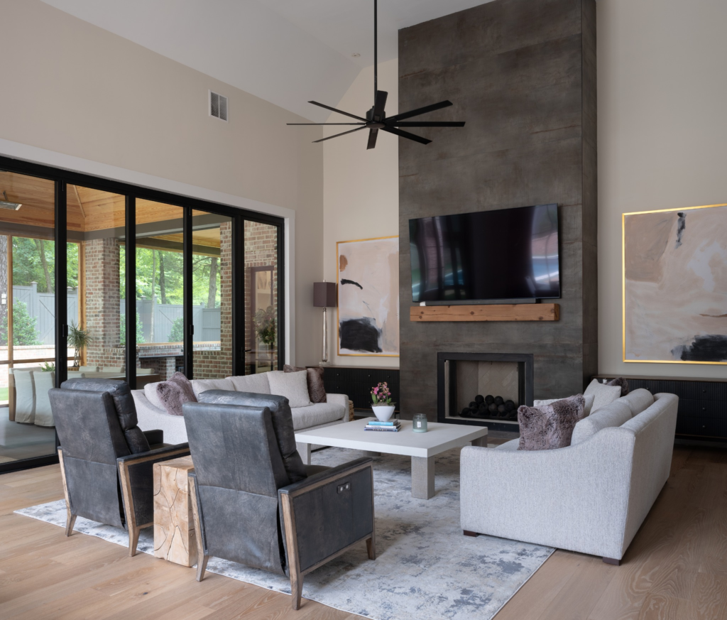 This high-ceiling living room with a dark grey fireplace makes a statement wall, with the rest in subtle hues.