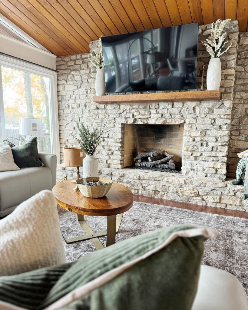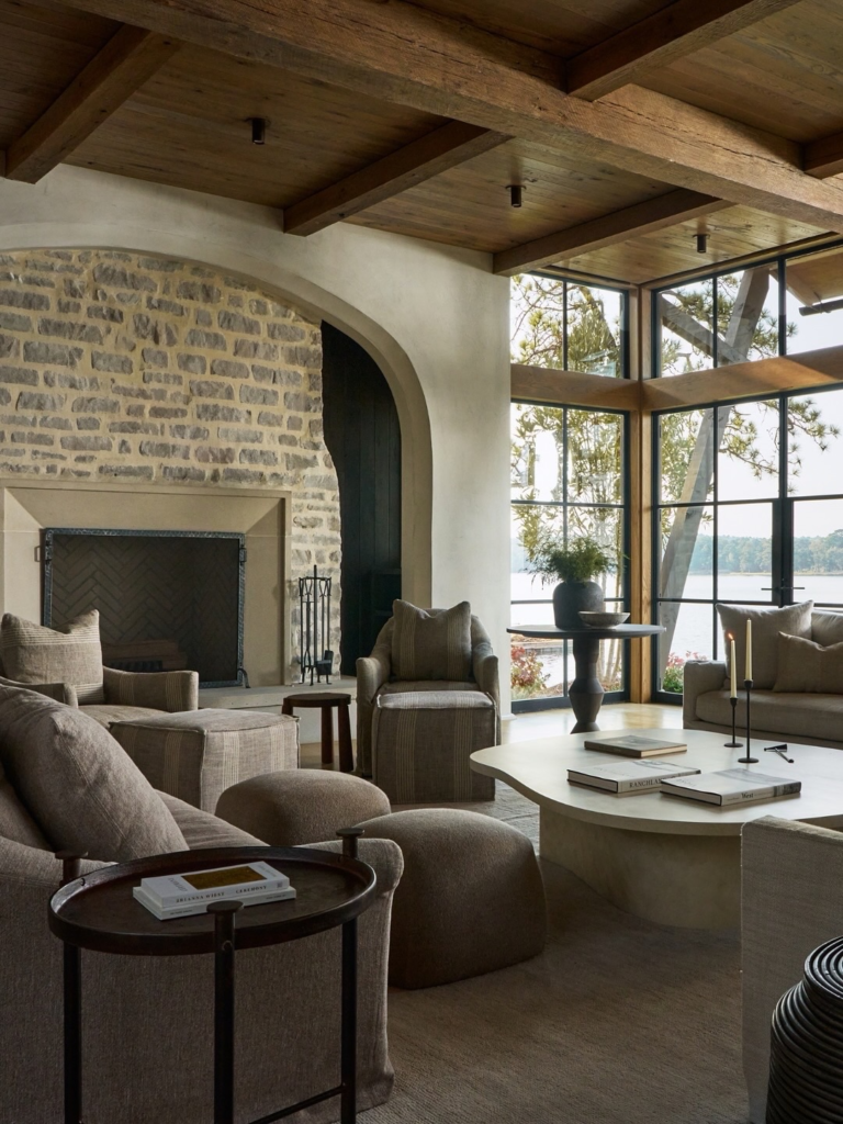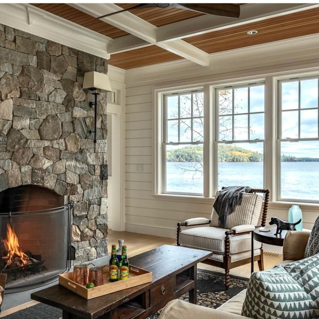 One thing that makes this interior so classic is the stone fireplace, the most essential addition to your cozy lake house living room.