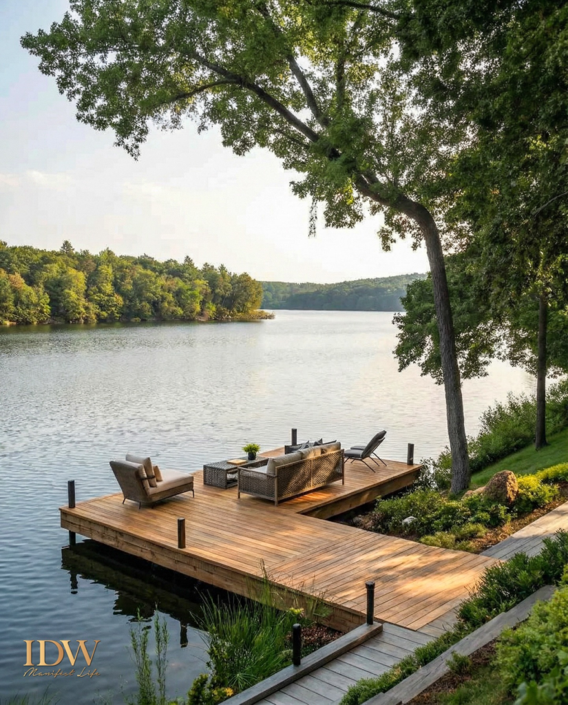 The wooden dock of a classic-styled house lets you fully utilize the lake for fun and soothing evenings. I suggest a wooden dock as it resonates with the surrounding natural beauty.