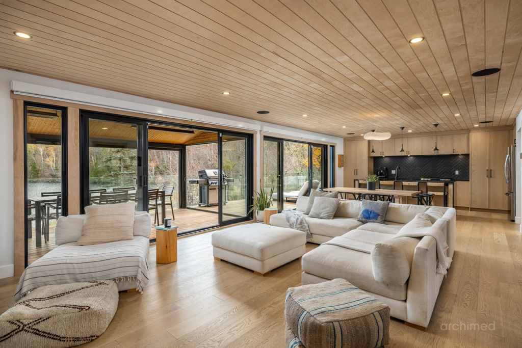 The wood ceiling panels add enough warmth, while the large windows keep the room airy and bright.