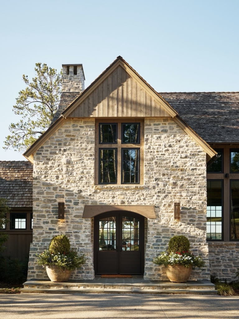 The stone walls perfectly display traditional architecture while having enough modern touches with wall lights and statement planters.