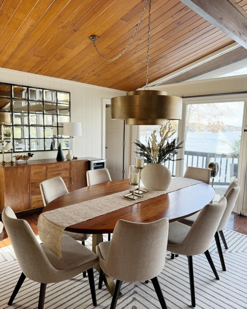 You get a warm atmosphere with the wood-paneled ceiling, and the modern brass pendant lighting adds enough modern touch for a luxurious appeal.