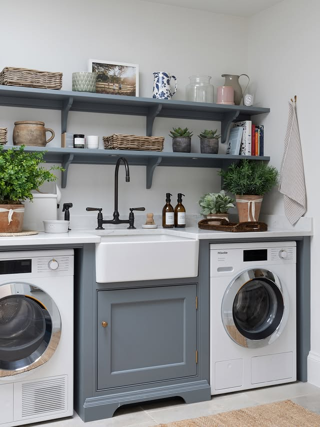 Here is a hygienic, effective and operational utility room with a grey colour countertop work space with an amazing white butler sink.