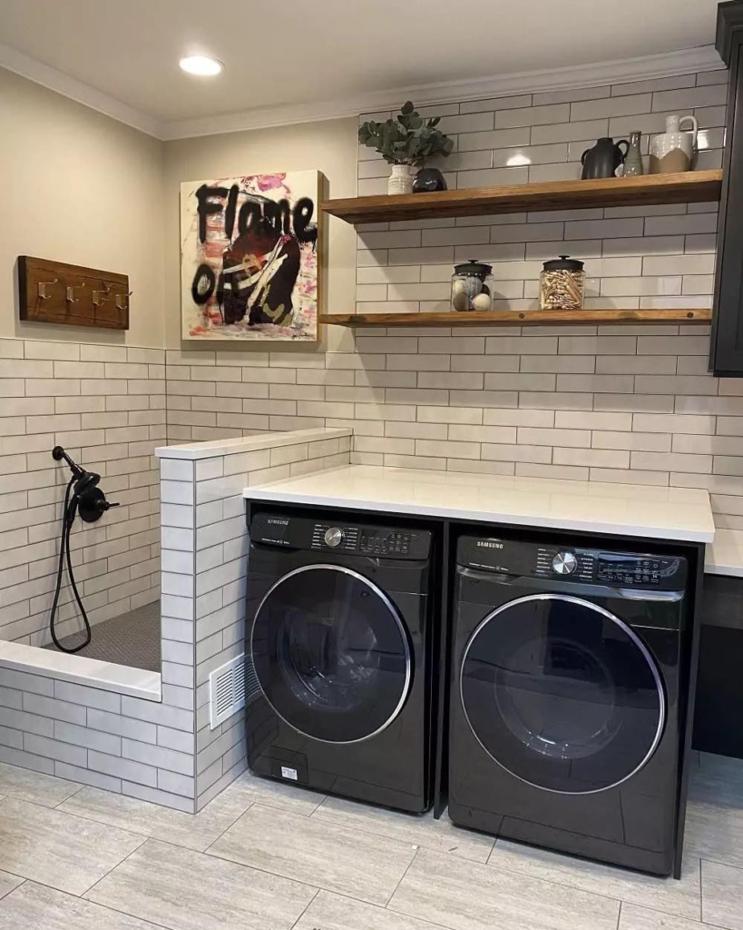 On left hand side, there is a dog wash area, and the shelves will help you to give you a shelter for dog things as well, and if you put the shelves with the artwork, it means you are a person who knows the value of things and their place.