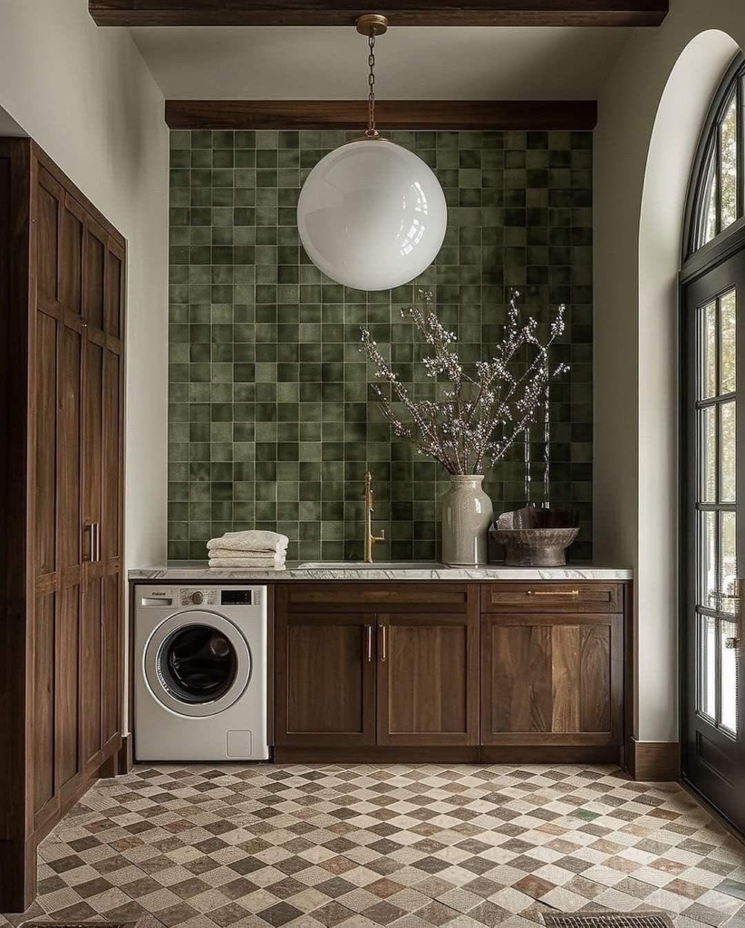 Don’t want to do laundry? Then may be metallic accent with the wooden light, walnut brown touch, and the white pendant globe of your laundry room will change your heart.