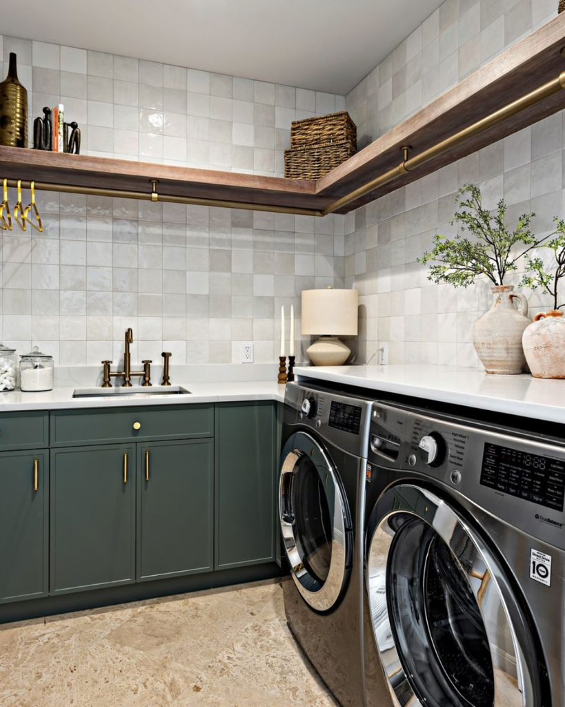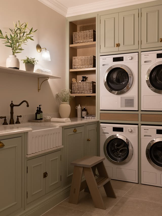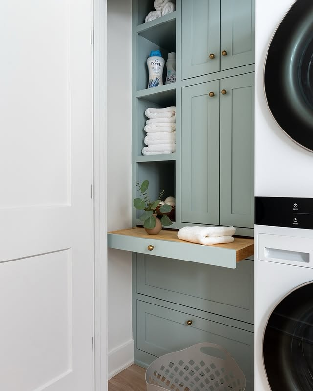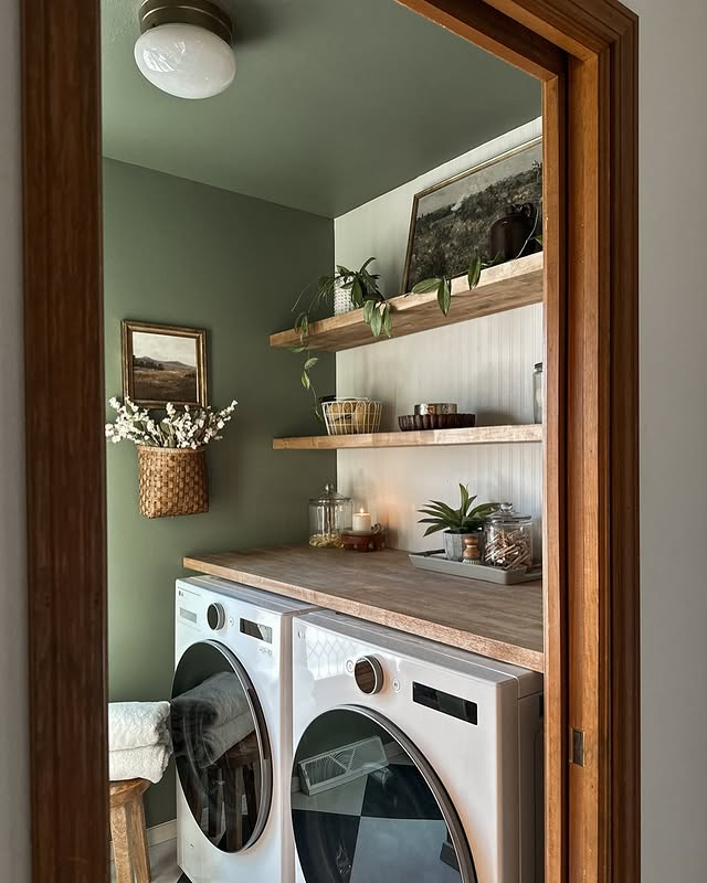 Sage green laundry room with the minimalist shelves, this is the right thing that you need.