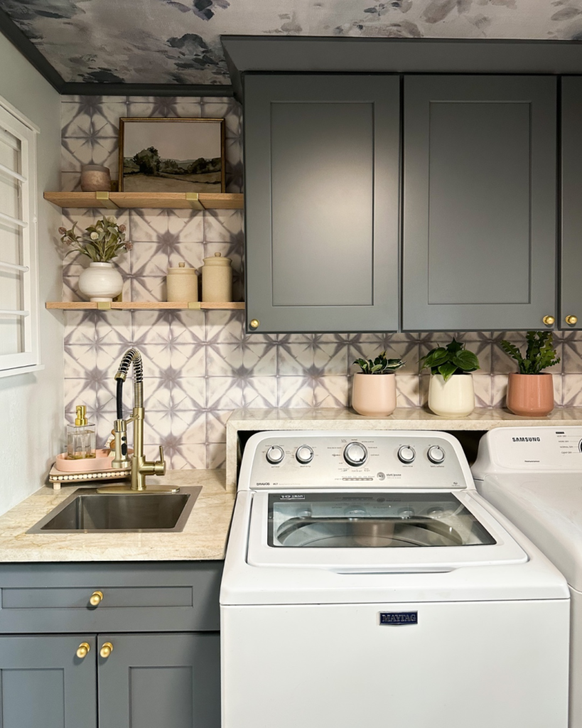 Laundry Room with Open Shelving and Moroccan Tiles