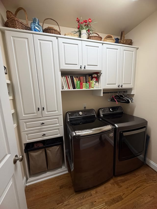 Natural wood vertically stacked shelf, an amazing and smooth countertop playing the role in the symmetry of the laundry room, open cabinet shelves at left side of the dryer machine with a natural oak medium-toned hardwood floor are saying they don’t need the colours, they want to be more organic.