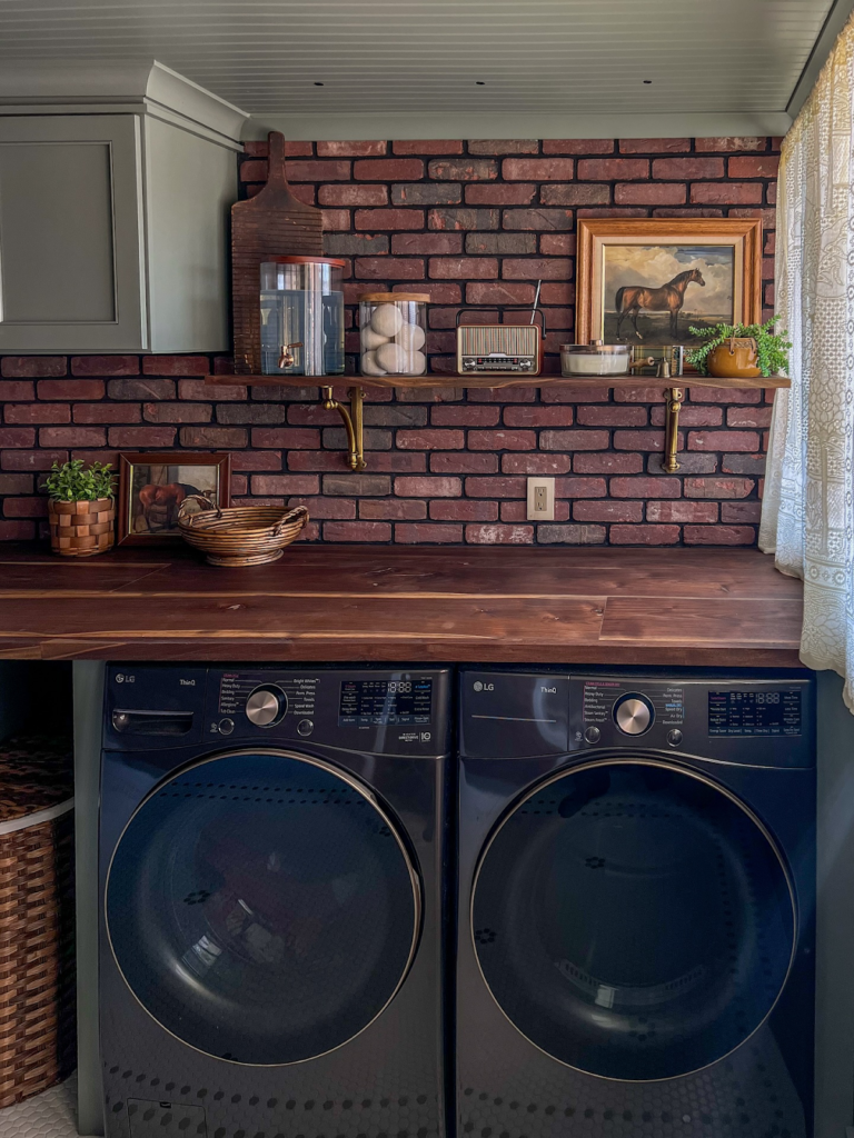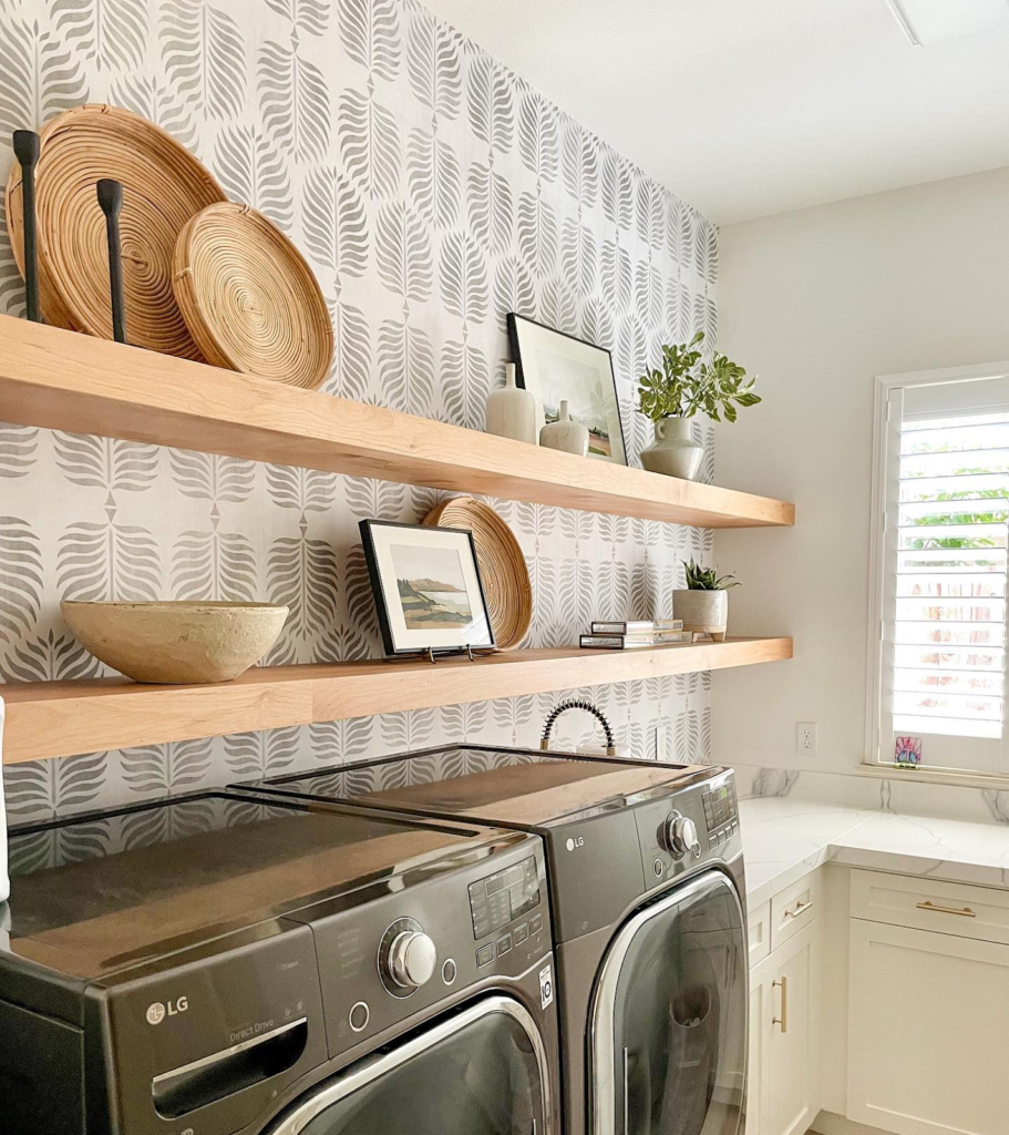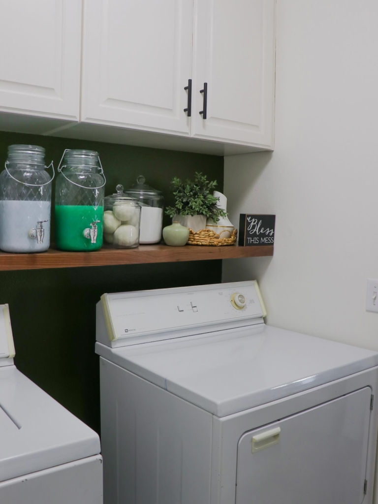 These two thick, natural-looking floating shelves will give you the best place in the laundry room to put your decorative and intuitive jars.