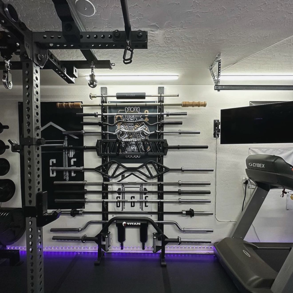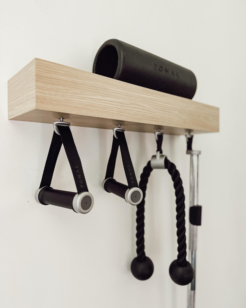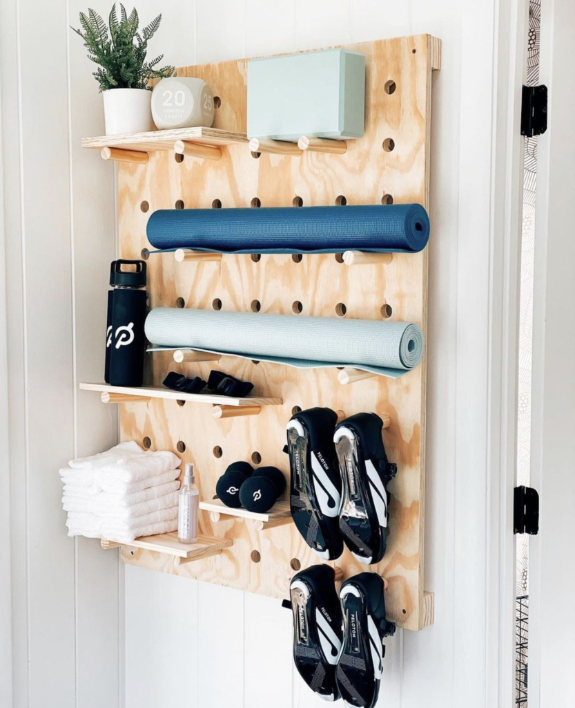 If you have a limited space on your floors, then wall-mounted gym storage can be a great solution for your mini at-home gym.