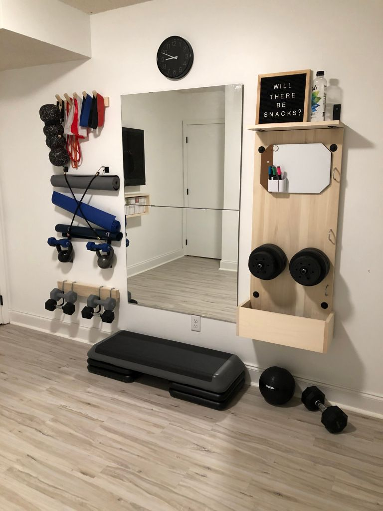 You can use wall-mounted racks for dumbbells, bands, and mats free up space. I think using this approach keeps everything accessible and visible.