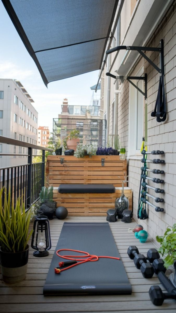 Balcony is not just about aesthetics or decorations; you can use it for creating your mini gym at home that helps you to save your indoor space.