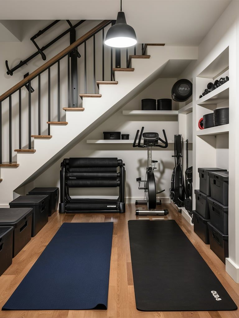 Your under-stair area can be a surprisingly functional space if you can install shelving for equipment there, and you can use the floor for your workout.