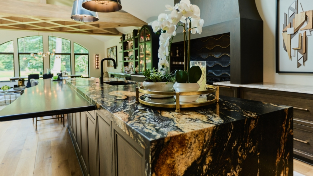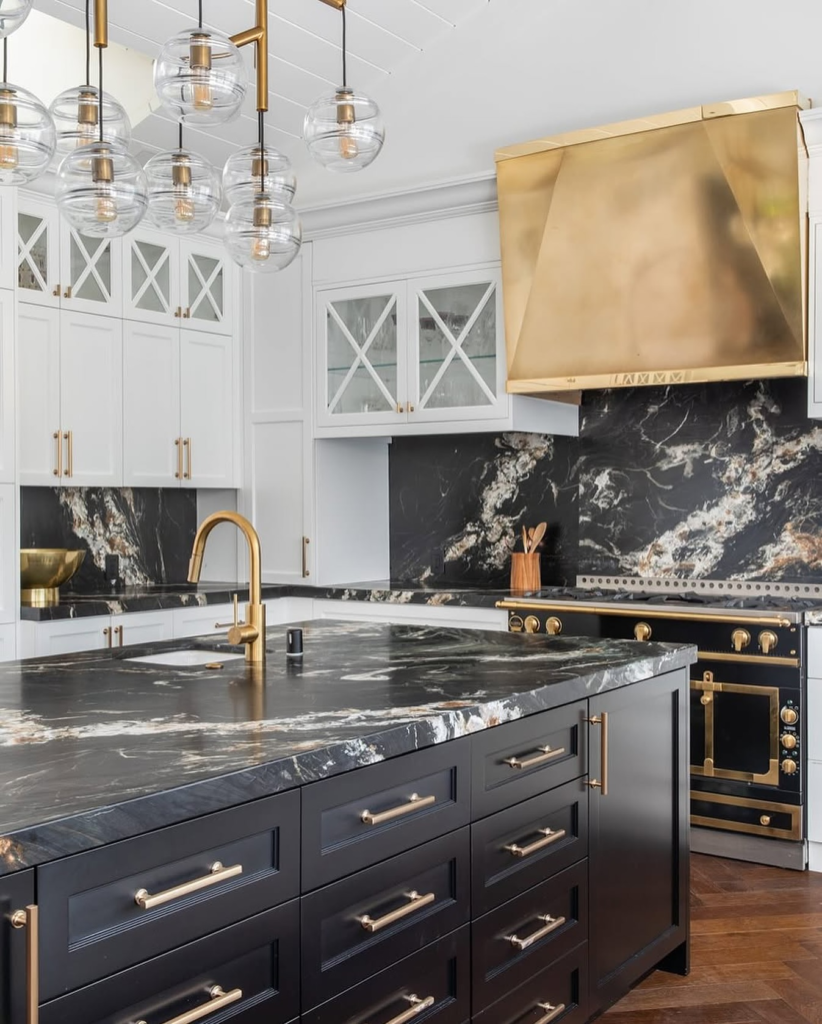 If you want your kitchen to feel high-end and glamorous, consider adding gold hardware accents to your black marble kitchen.