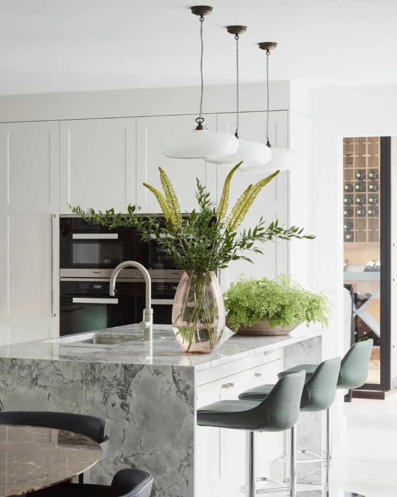 Black and white kitchens are a popular trend, and the white marble countertops and black cabinetry in this kitchen is a stylish way to incorporate the trend.