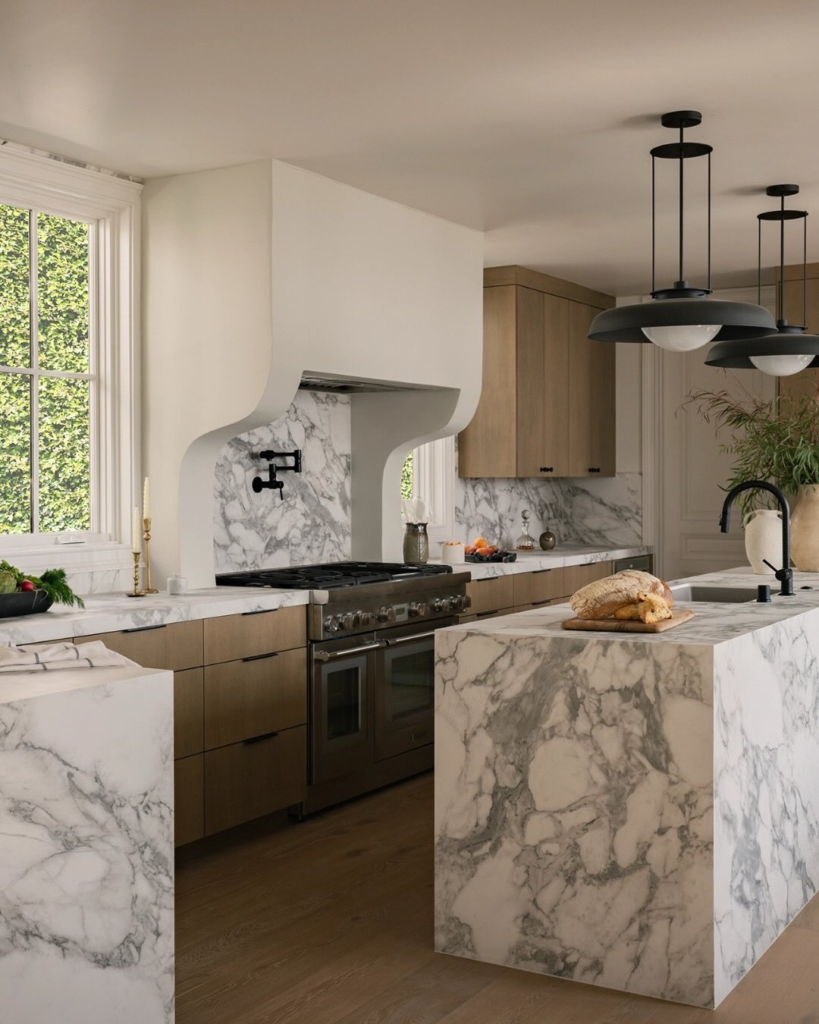 The marble hood in this kitchen adds a pop of color and pattern to the space, and it creates a beautiful focal point.