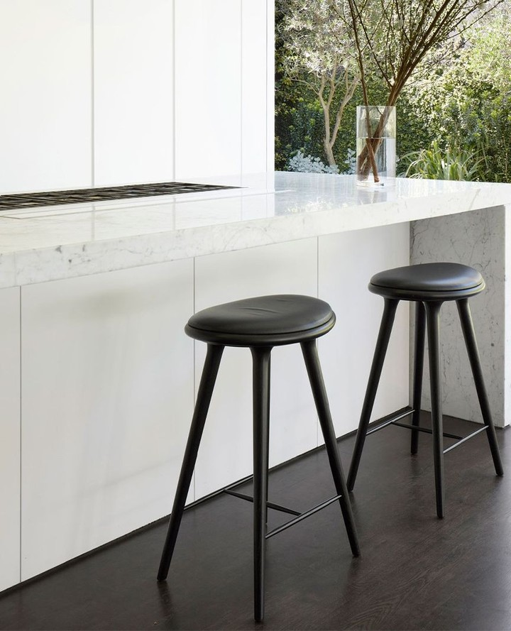 The black marble island is the star of this kitchen, so the designers chose minimalist black stools to let the island take center stage.