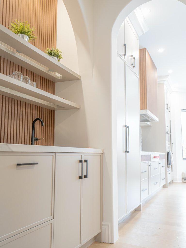 The floor to ceiling built-in shelving is perfect for storing all of your kitchen necessities. The marble and gold accessories are the perfect finishing touch to this stunning pantry.