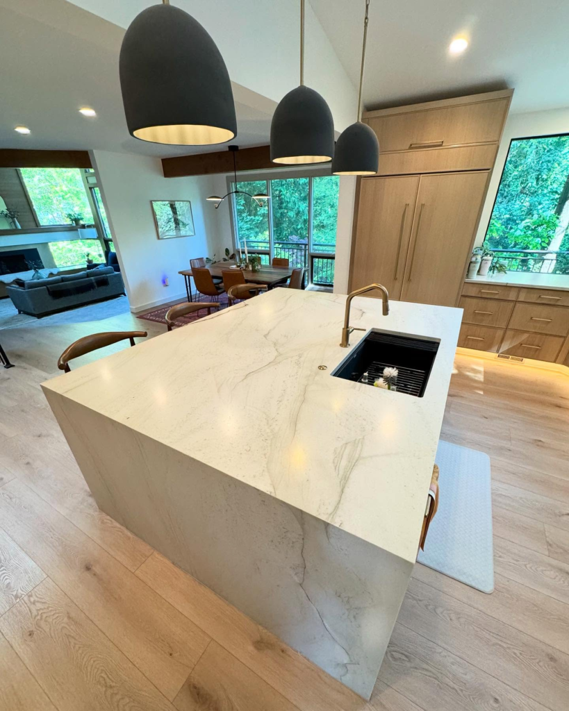 The island is so large that it can be used for cooking, dining, and entertaining. The waterfall design creates a seamless look that is very popular in modern kitchens.