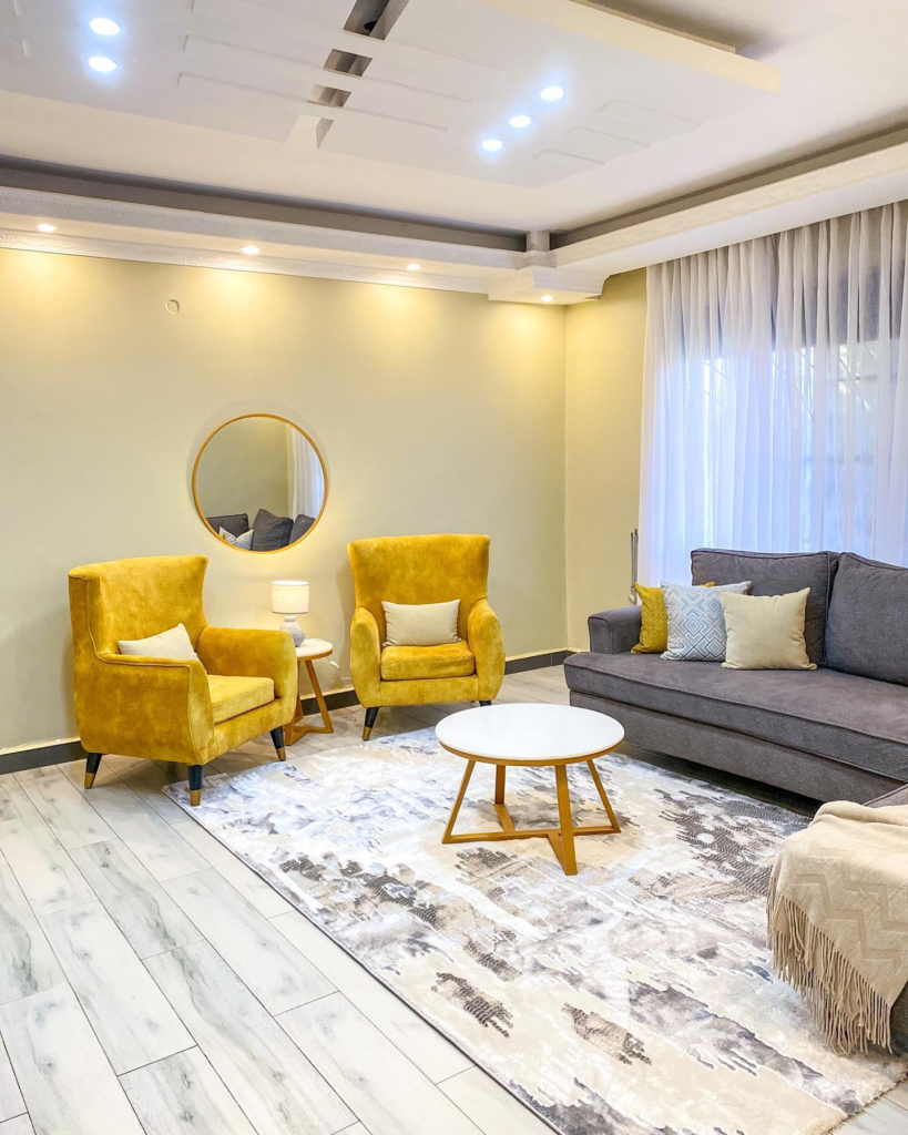 The mustard and gray accents in the room add a little bit of color to this otherwise neutral space.