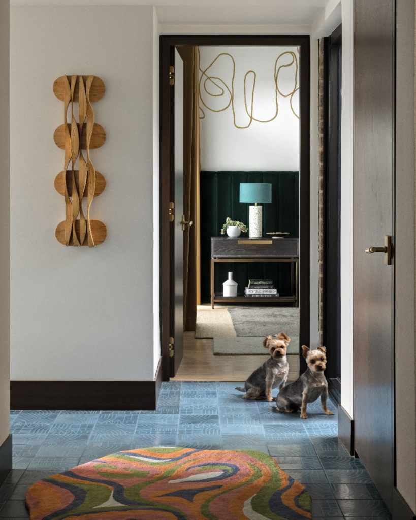 In this room, the mustard and gray rug adds a pop of color to the space. And, the colors in the rug are repeated in the artwork above the bed, helping to tie the whole room together.
