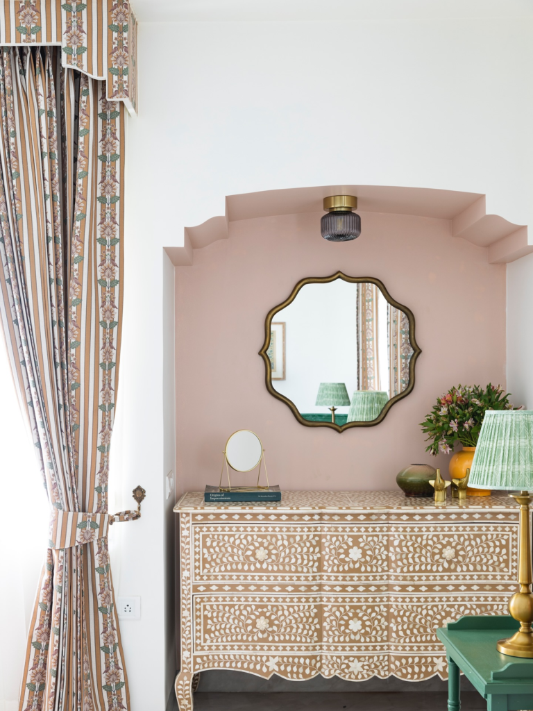 The key to layering textiles is to stick with a consistent color scheme, but feel free to mix patterns and materials. In this room, we see a mix of velvet, linen, wool, and cotton textiles, and it all works beautifully together.