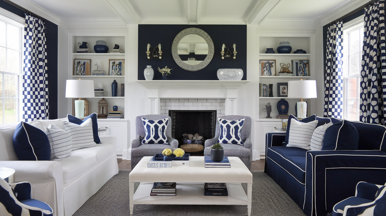 Layering different shades of navy creates depth. Use light navy pillows, medium navy curtains, and deep navy furniture. Then break everything up with crisp white accents.