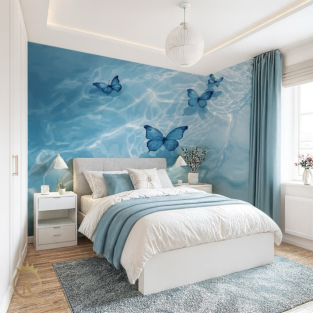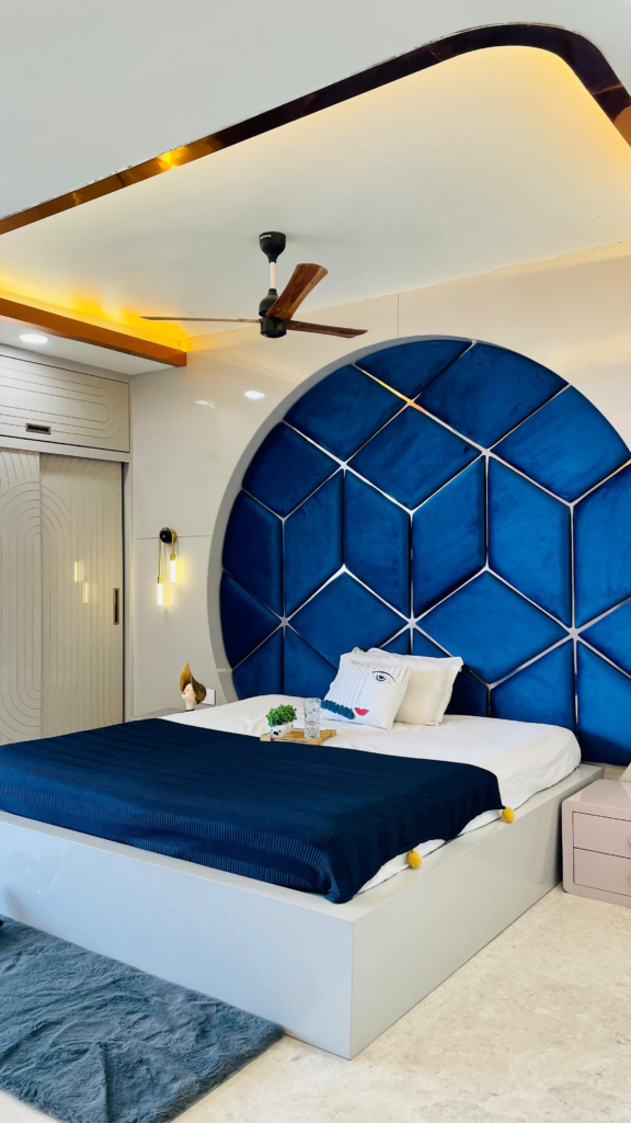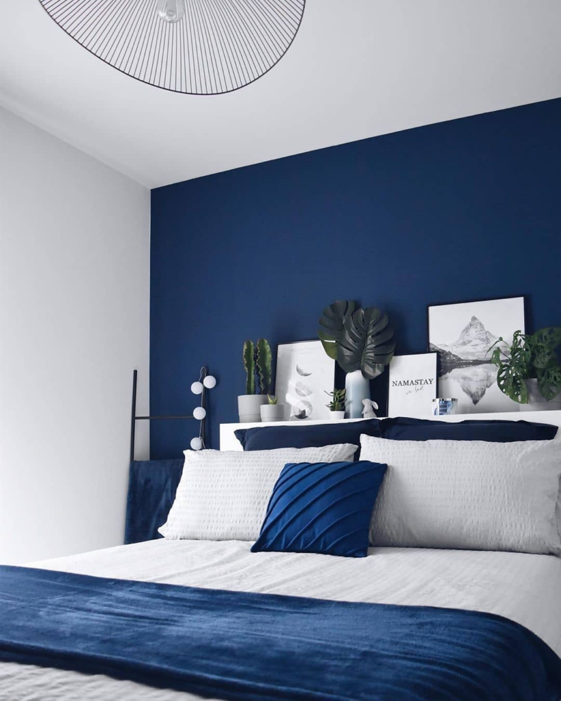In this bedroom, a royal blue accent wall pairs beautifully with a soft beige wall and a white ceiling.