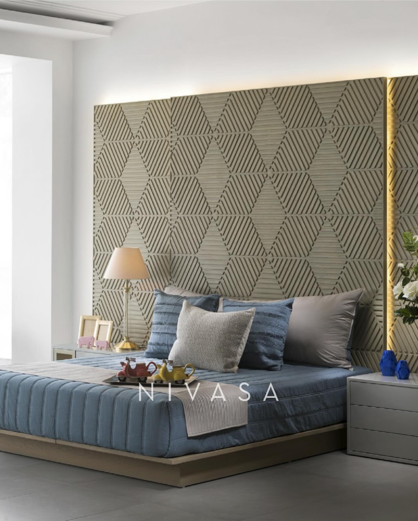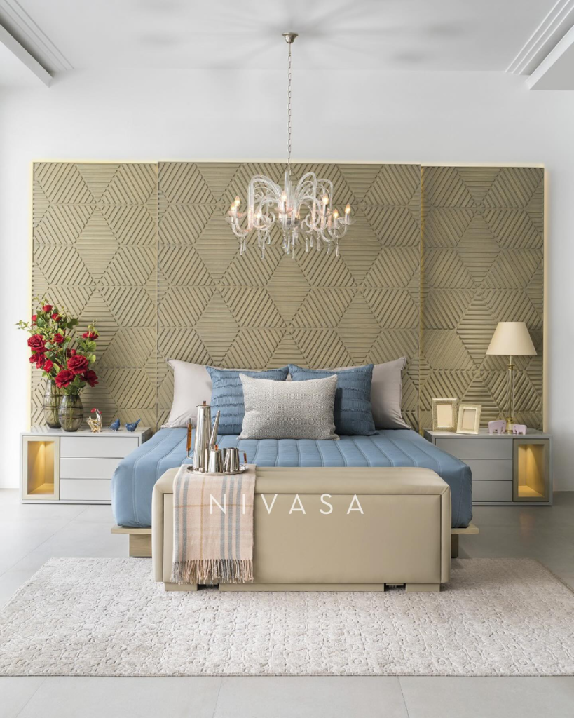This modern bedroom designed by Nivasa pairs a royal blue accent wall with a mix of other rich colors, including terracotta and a deep green.