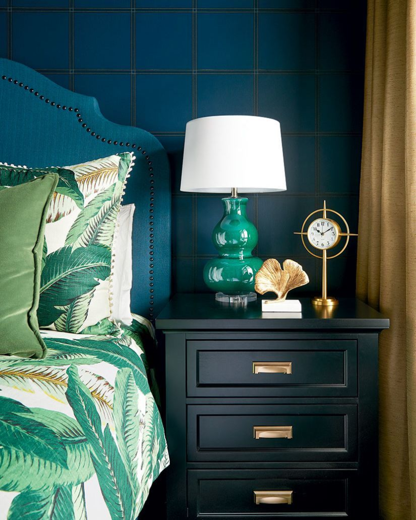 Add in a few metallic gold accessories to your royal blue bedroom, like a table lamp, picture frame, or throw pillow.