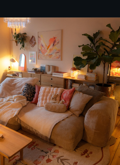 The space is made easy with the addition of soft pillows and blankets. This ultimately sprays life and color.