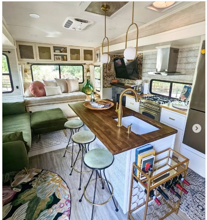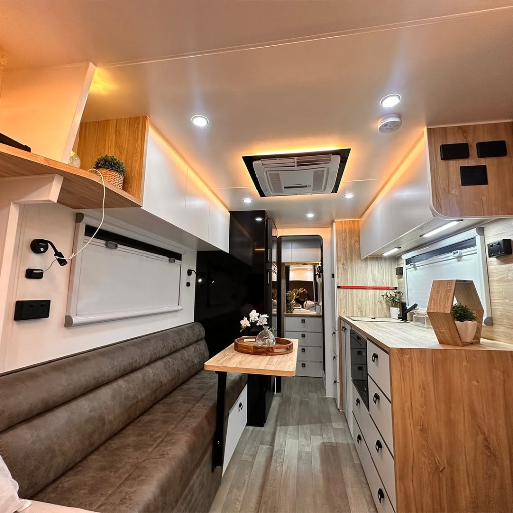 Keeping a tone of luxurious details can make the space look elegant. Having an RV living space in a van that has all the retro style and that looks like a palace.