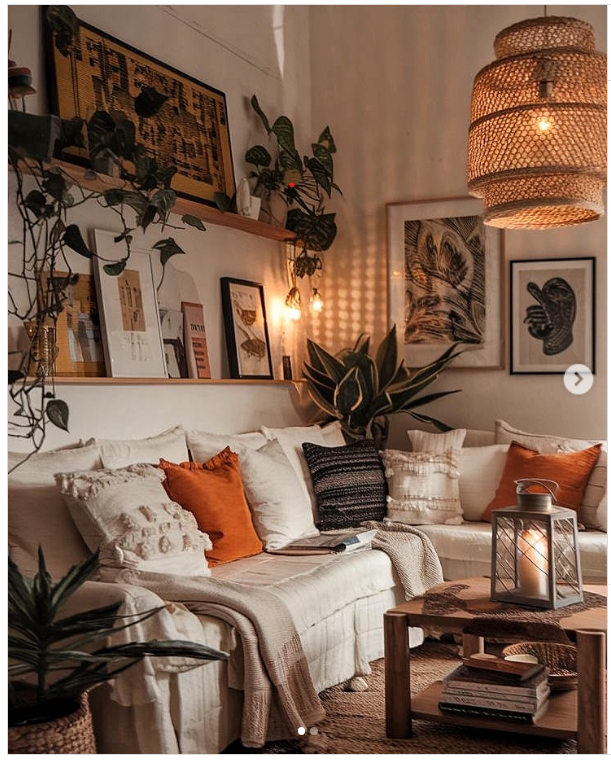 A mixture of vibrant colors, crackling of the wood fire, and dull lights makes the space warm.