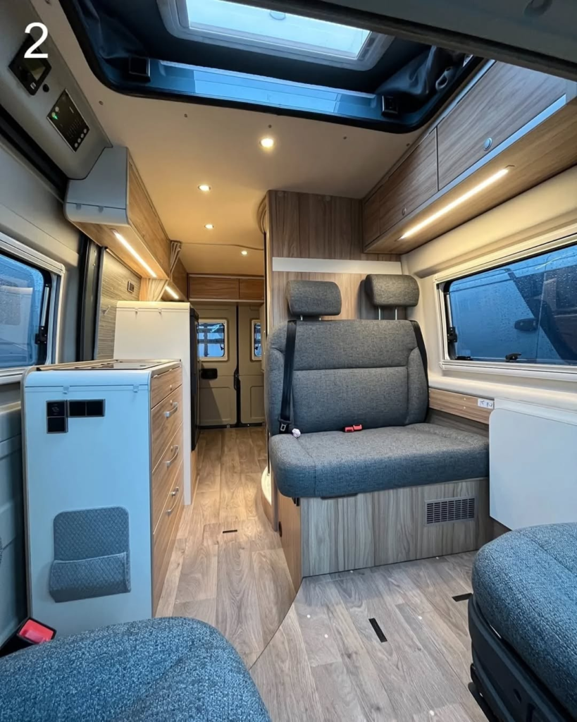 Having a unique van with double sliding doors turns the RV living room into a completely unique layout.