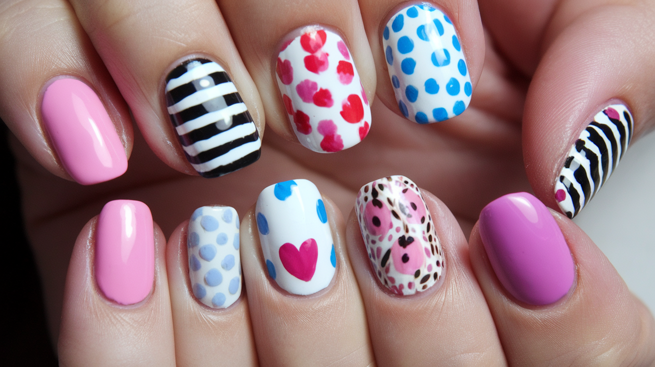 Each nail a different soft color. Think lavender, baby blue, peach, mint—it’s like a mini spring rainbow on your hands.