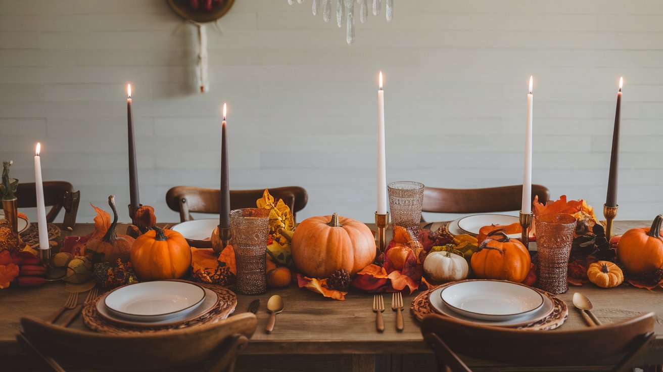 Burnt orange napkins, burgundy candles, or mustard-yellow glassware can add warmth without overwhelming your table. Pick one bold color and sprinkle it throughout.